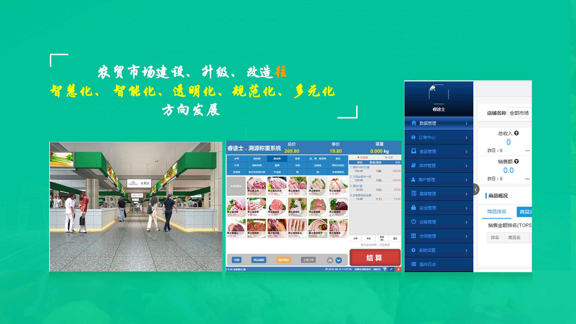 創(chuàng)新實(shí)現(xiàn)了【智慧農(nóng)貿(mào)溯源管理系統(tǒng)】與【智能稱重收銀】一體化解決方案,集市場(chǎng)管理、運(yùn)營(yíng)管理、溯源追溯、智能收銀大數(shù)據(jù)運(yùn)用于一體,硬件、軟件與管理系統(tǒng)完美結(jié)合。適用于農(nóng)批、農(nóng)貿(mào)市場(chǎng)蔬菜、生鮮、水果、水產(chǎn)、肉類、熟食等稱重和非稱重銷售;由于采用一體化設(shè)計(jì),解決了傳統(tǒng)農(nóng)貿(mào)市場(chǎng)無(wú)法實(shí)現(xiàn)的信息化、智能化、可追溯的管理問(wèn)題;使稱重、收銀、追溯、管理、更透明、公正、安全,讓顧客無(wú)后顧之憂,給管理工作帶來(lái)極大的便捷與高效,對(duì)國(guó)內(nèi)農(nóng)產(chǎn)品行業(yè)的發(fā)展、農(nóng)產(chǎn)品流通管理起到了典范作用。 【睿途士首創(chuàng)】顛覆傳統(tǒng)的“智慧農(nóng)貿(mào)市場(chǎng)系統(tǒng)”,解決了傳統(tǒng)農(nóng)貿(mào)系統(tǒng)單一安卓掛屏,昂視不方便看、不直觀、無(wú)互動(dòng)性,傳輸信息不齊全、不穩(wěn)定的問(wèn)題,也解決了按鍵電子秤商品難找、商品代碼難記、按鍵操作不靈活、支付不智能,對(duì)收銀管理、銷售商品、菜名、菜價(jià)、打折、優(yōu)惠、會(huì)員、線上下單、采購(gòu)等無(wú)法實(shí)現(xiàn)實(shí)際菜品交易和追溯等問(wèn)題。 更具顛覆性的是睿途士智慧系統(tǒng)擁有三大管理平臺(tái)(市場(chǎng)管理平臺(tái)、總部運(yùn)營(yíng)管理平臺(tái)、商戶后臺(tái)管理平臺(tái))、一個(gè)可視操作前臺(tái)和三大追溯功能,讓遠(yuǎn)程管理、數(shù)據(jù)傳輸、人機(jī)互動(dòng)、智能控制、移動(dòng)支付、大數(shù)據(jù)、互聯(lián)通信、云端存儲(chǔ)、人工智能、智能城市、電子定位、智能收銀等功能得以實(shí)現(xiàn)。